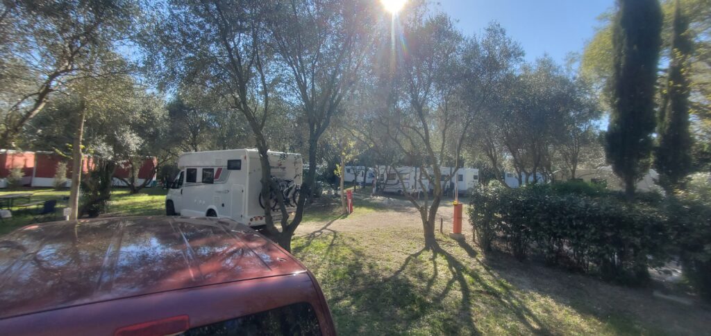 Nun sitzen wir hier auf einem kleinen Campingplatz nicht weit vom Meer und beobachten andere Reisende beim Einparken ihrer Monster-Wohnmobile. Das Osterwochenende bringt die weiße Flotte so richtig in Schwung. Bis gestern waren wir noch ziemlich allein auf weiter Flur, heute dagegen wird es eng hier: Gerade parkt ein mindestens acht Meter langer, knapp drei Meter hoher fabrikneuer Fiat Rimor mit größter Mühe in eine Parzelle ein, die nur minimal größer ist als das Fahrzeug. Die wunderbaren Olivenbäume, deren Schatten wir seit gestern so schätzen, erleichtern die Sache nicht, denn nach oben ist wenig Platz.